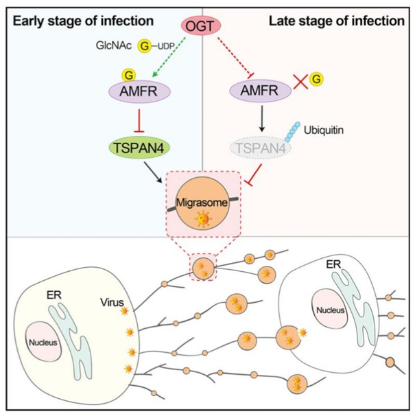 图1 病毒感染过程中,通过AMFRO-GlcNAc糖基化和TSPAN4泛素化修饰,动态调控迁移体形成的机制模型