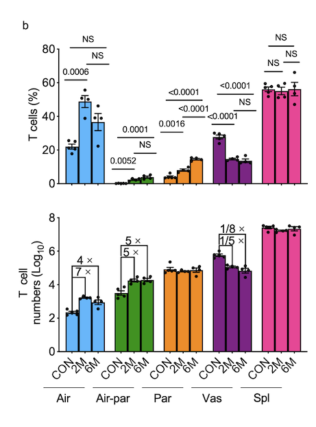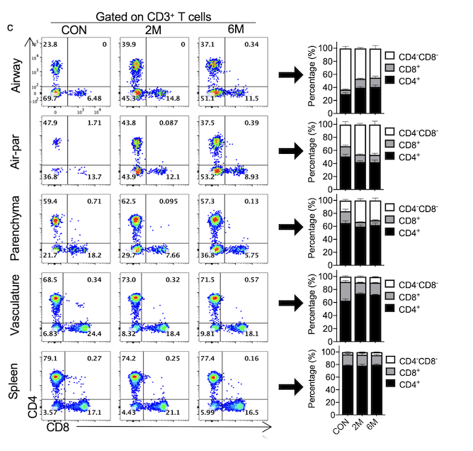 研究结果显示,烟雾暴露显著改变了T细胞的空间分布和迁移模式。与空气对照组相比,气道内T细胞数量明显增加,且在暴露2个月时最为显著;与此同时,血管内T细胞数量相应减少(图2)。这一现象提示,在烟雾刺激下,T细胞可能由循环系统被持续募集至气道区域,参与局部免疫应答和炎症反应。