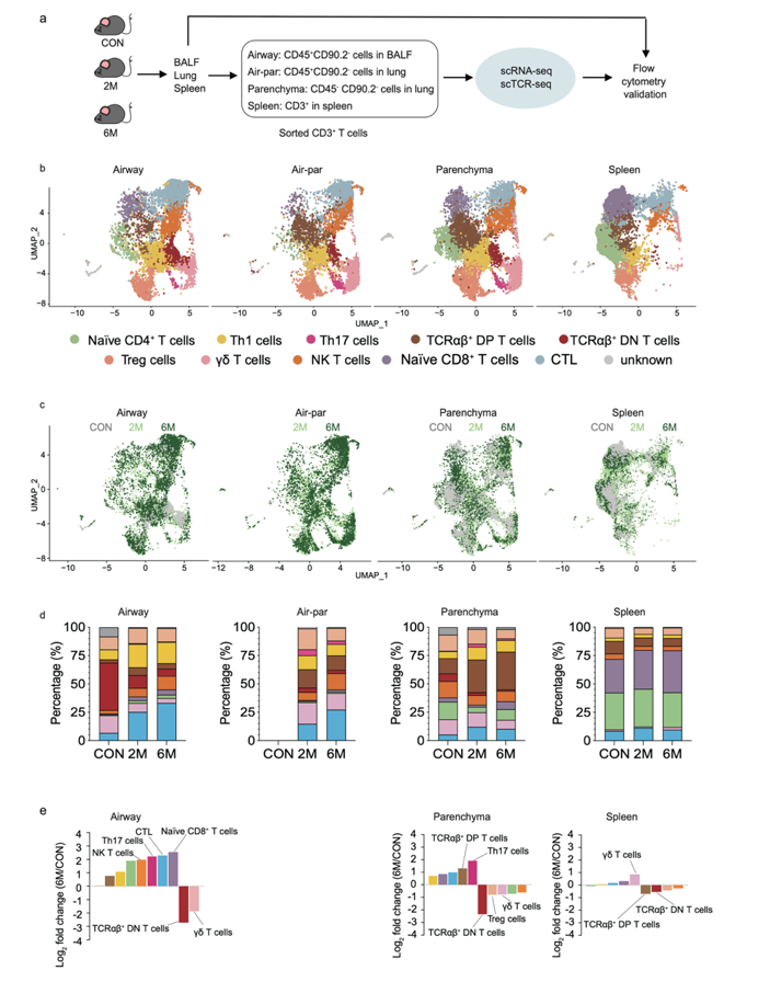 2025年12月,广州医科大学附属第一医院/广州国家实验室冉丕鑫教授、王忠芳教授和周玉民教授团队在国际权威期刊Nature Communications(IF:15.7)发表研究论文“Comprehensive profiling of smoke-induced T cells in mice implicates clonal γδT17 cells as a hallmark of COPD”,通过多维度单细胞技术和功能学实验,系统描绘了烟雾相关的T细胞免疫图谱,并首次明确克隆化扩增的γδT17细胞在COPD发生发展中的关键作用。冉丕鑫教授、王忠芳教授与周玉民教授为本文共同通讯作者,梅馨月博士后、王俊翔副研究员、王媛博士及程莉为本文共同第一作者。