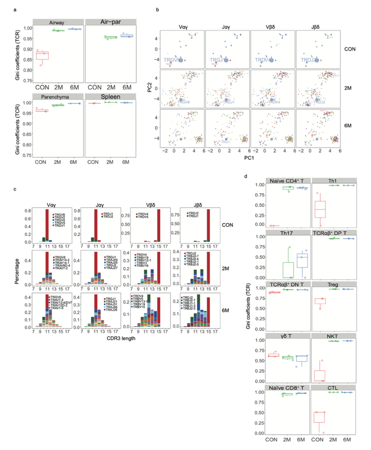 为评估烟雾暴露后T细胞是否经历抗原驱动的克隆扩增,研究团队将单细胞靶向转录组与TCR测序相结合,对不同组织部位的T细胞克隆特征进行了系统分析。结果发现,烟雾暴露后,气道T细胞可能受到多种抗原的刺激,进而导致其TCR克隆的多样性与特异性增强。相比之下,γδT细胞则维持着相对稳定的克隆特征(图5),这一发现引起了研究者的进一步关注。