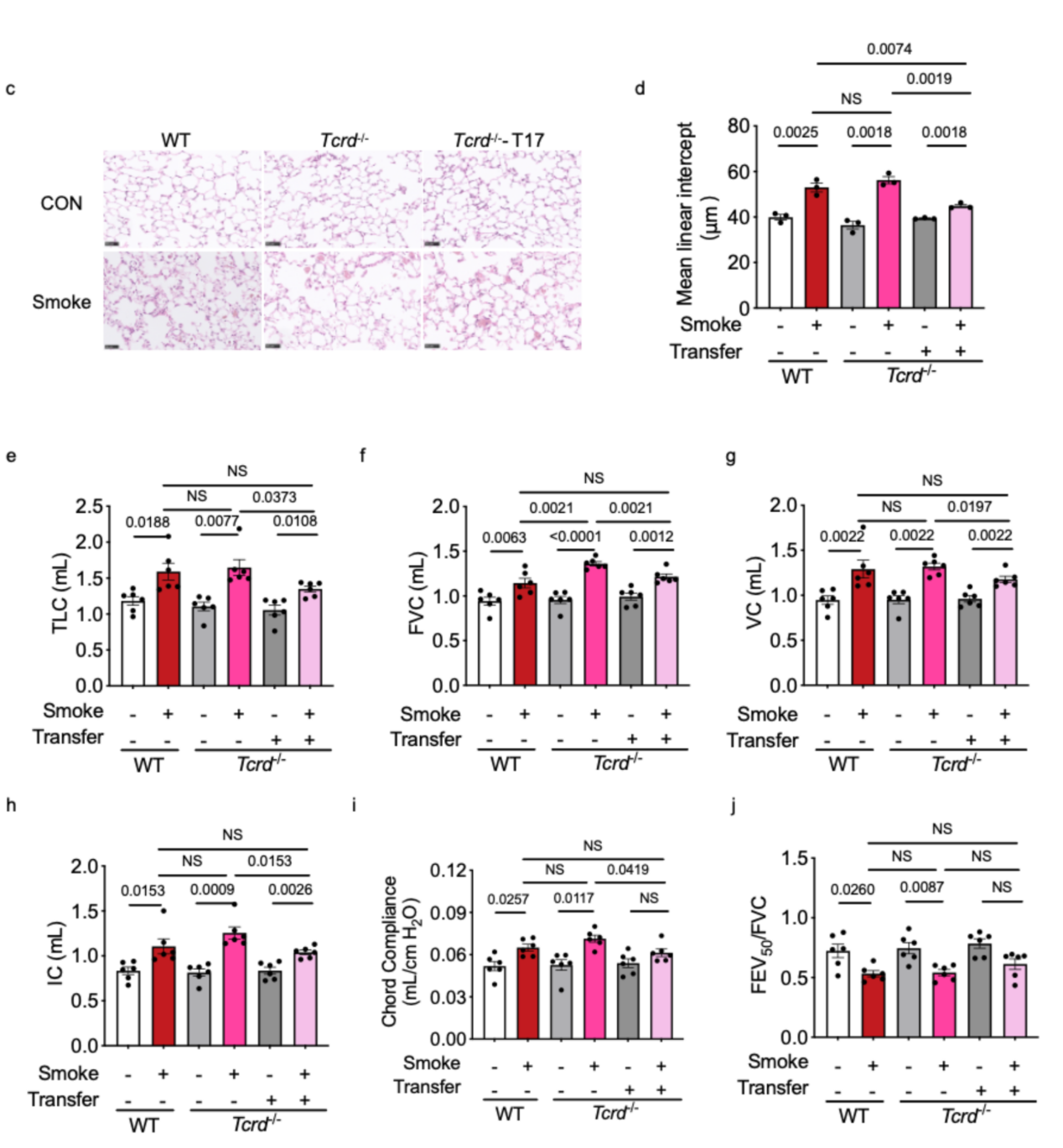 在功能学层面,研究团队通过体内动物实验进一步验证了γδT17细胞在烟雾诱导肺损伤中的作用。结果显示,敲除γδT细胞可显著加重气道炎症和肺气肿样病变,而回输体外扩增的γδT17细胞则可明显改善肺组织结构损伤和气流受限(图8)。这一结果表明,尽管γδT17细胞产生于炎症环境,但其在慢性烟雾暴露条件下具有重要的组织保护和修复潜力。
