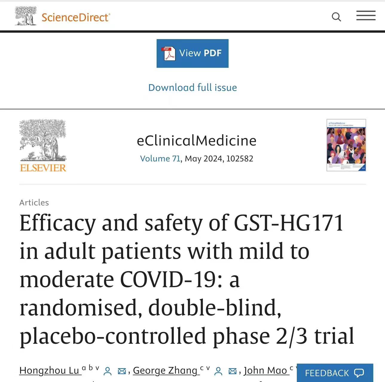 1.Hongzhou Lu, George Zhang, John Mao, et al. Efficacy and safety of GST-HG171 in adult patients with mild to moderate COVID-19: a randomised, double-blind, placebo-controlled phase 2/3 trial. eClinicalMedicine. 2024;71:102582.