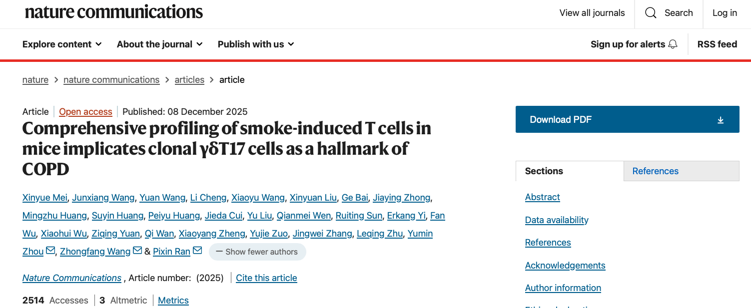 2025年12月,广州医科大学附属第一医院/广州国家实验室冉丕鑫教授、王忠芳教授和周玉民教授团队在国际权威期刊Nature Communications(IF:15.7)发表研究论文“Comprehensive profiling of smoke-induced T cells in mice implicates clonal γδT17 cells as a hallmark of COPD”,通过多维度单细胞技术和功能学实验,系统描绘了烟雾相关的T细胞免疫图谱,并首次明确克隆化扩增的γδT17细胞在COPD发生发展中的关键作用。冉丕鑫教授、王忠芳教授与周玉民教授为本文共同通讯作者,梅馨月博士后、王俊翔副研究员、王媛博士及程莉为本文共同第一作者。