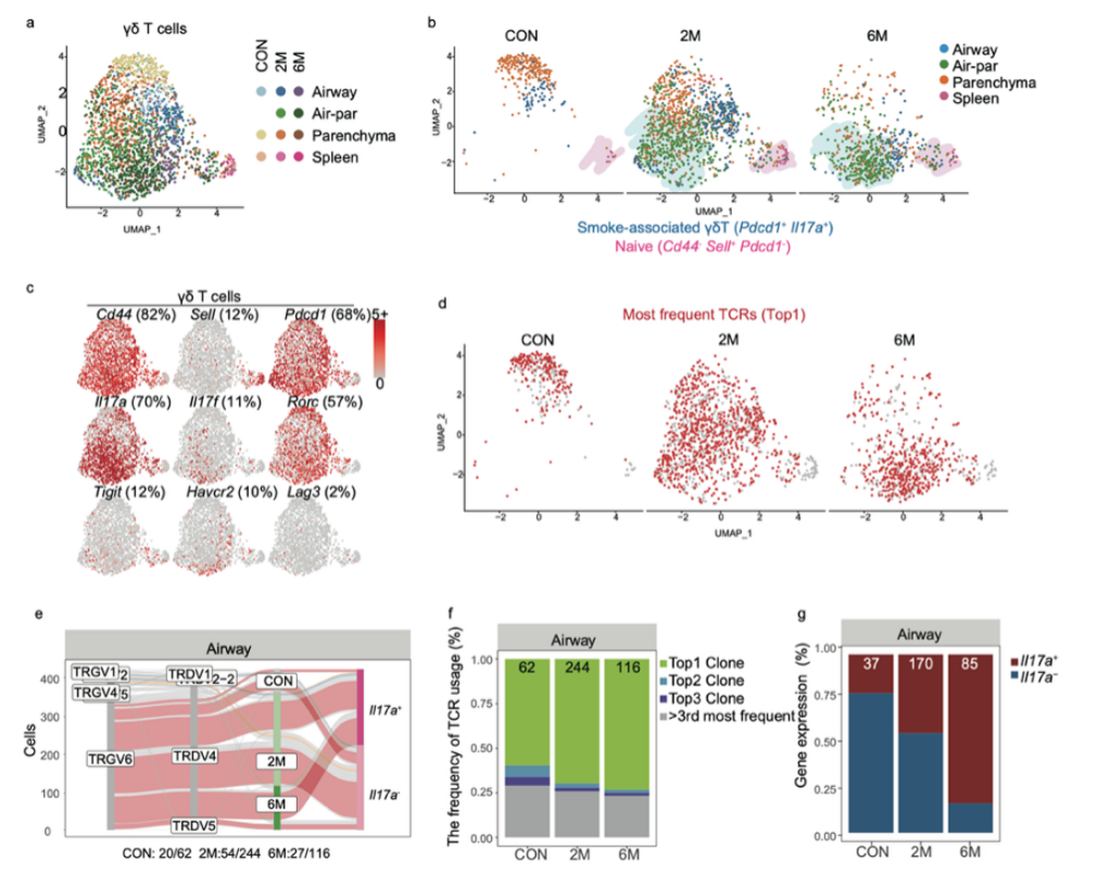 具体而言,烟雾暴露显著诱导γδT细胞高表达Il17a,并伴随着γ6δ4 T细胞这一优势克隆类型的明显扩增(图6a-d)。随着暴露时间延长,γ6δ4 T细胞持续发生克隆化扩增,并逐步获得典型的γδT17表型特征(图6e-g)。上述结果提示,克隆化扩增的γδT17细胞可能构成烟雾暴露相关免疫应答的标志性特征。