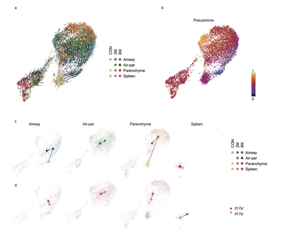 为进一步解析烟雾暴露下γδT细胞的发育轨迹,研究团队利用RNA velocity和拟时序分析方法,对不同时间点、不同肺部解剖位点及脾脏中的γδT细胞进行了系统追踪。
