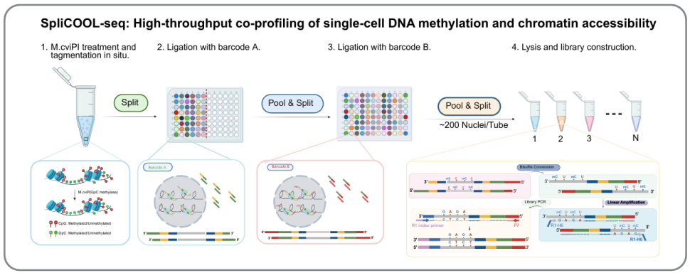 2026年1月28日,广州国家实验室范小英团队在Clinical and Translational Medicine杂志上发表了题“High-throughput single-cell DNA methylation and chromatin accessibility co-profiling with SpliCOOL-seq”的研究论文,开发出一种名为SpliCOOL-seq的高通量单细胞多组学测序技术(图1)。该技术突破性实现数千个细胞的全基因组DNA甲基化和染色质可及性同步精准测量分析,为解析肺腺癌等呼吸系统恶性肿瘤的表观遗传调控机制、推动精准诊疗提供了全新工具。